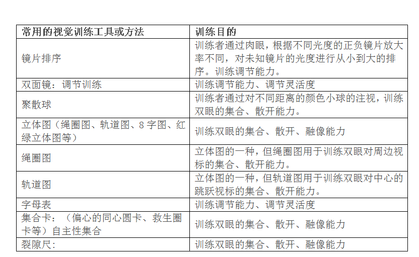 先看看我们日常工作中常用的一些视觉训练工具、方法或使用相应工具的训练目的如下表: