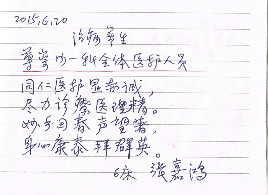 住院患者感谢内一科全体医护人员