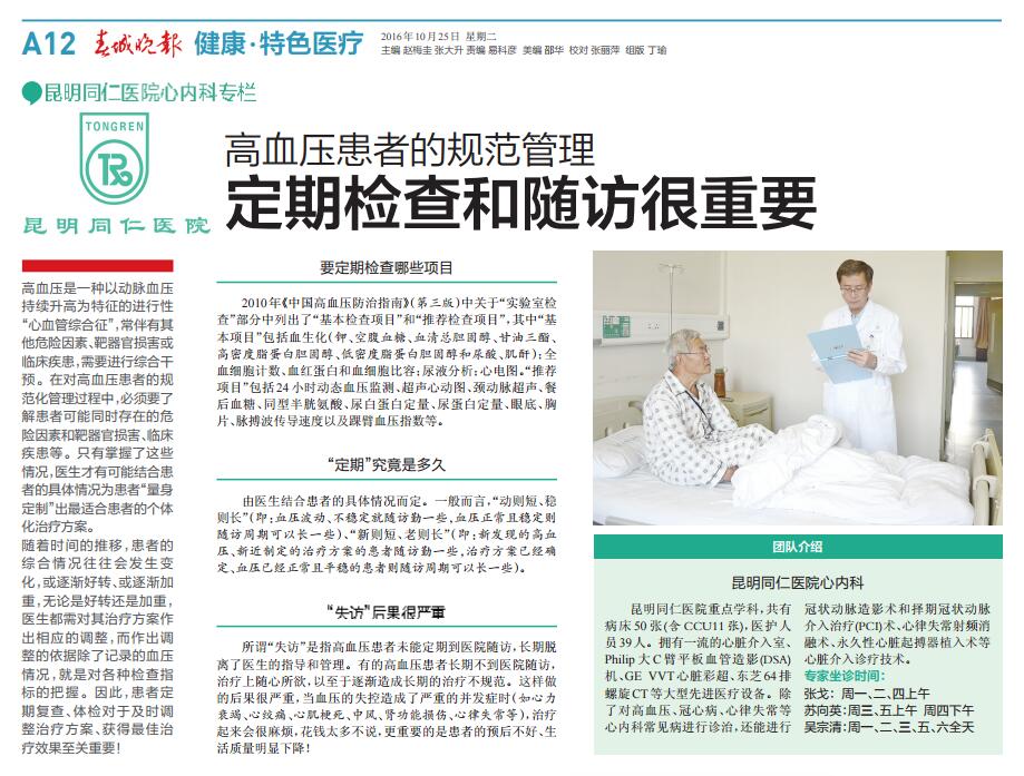 心内科专栏:高血压患者的规范管理 定期检查和随访很重要