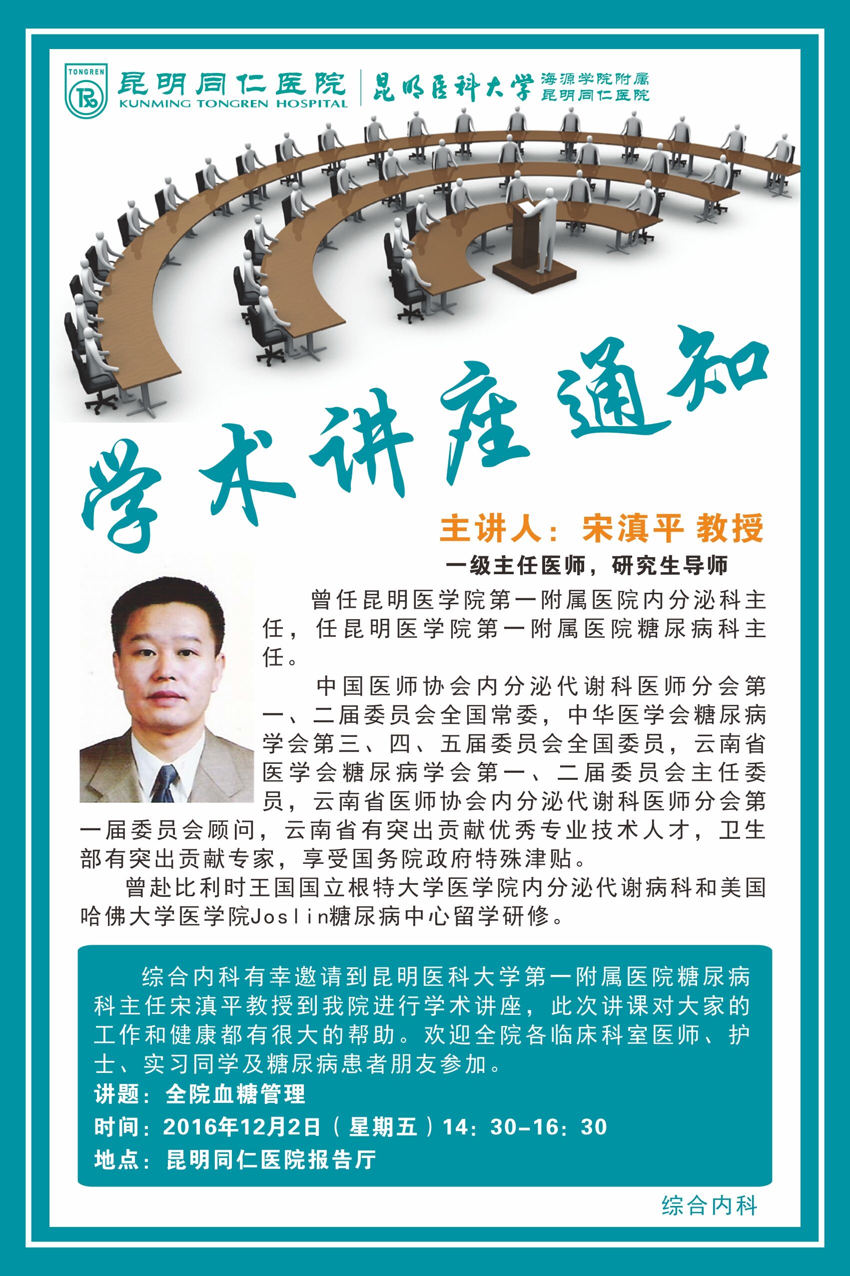 为了让更多患者更好地认识糖尿病和管理自己的血糖。飞禽走兽攻略站 特邀昆明医学院第一附属医院糖尿病科主任:宋滇平,于12月2日到我院举行《全院血糖管理》学术讲座。欢迎各位患者及医护人员积极参与、学习。