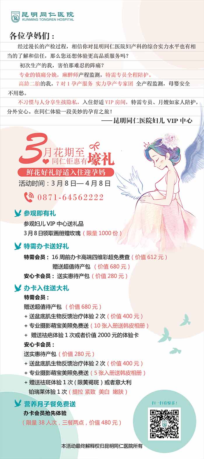 3月8日妇女节即将到来之际,昆明飞禽走兽 妇儿VIP中心更有为期一个月的豪礼相送活动(3月8日——4月8日),参观病房、办理会员卡、入住产科等均有温馨超值礼品, 各位孕妈敬请关注哦!咨询电话0871-64562222