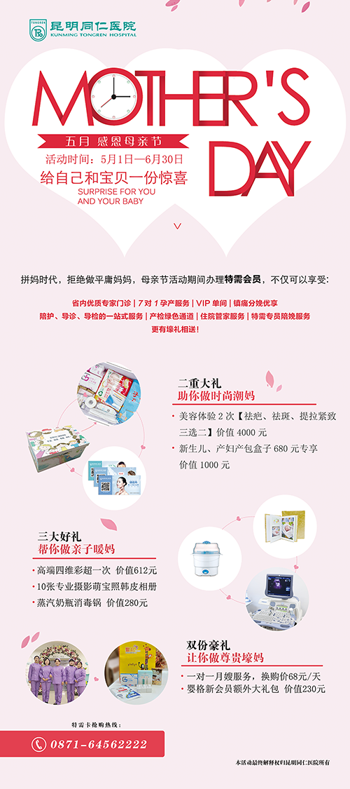 本次活动精心设置了很多的环节,准备了特殊的礼物送给爸爸妈妈以及小宝宝们,并能永久保存。通过这样的环节设置,告诉孕妈妈们,从此刻起,胎宝宝就已经能感知到你的爱。心动不如行动,快拨打电话0871-64562222预约名额吧!