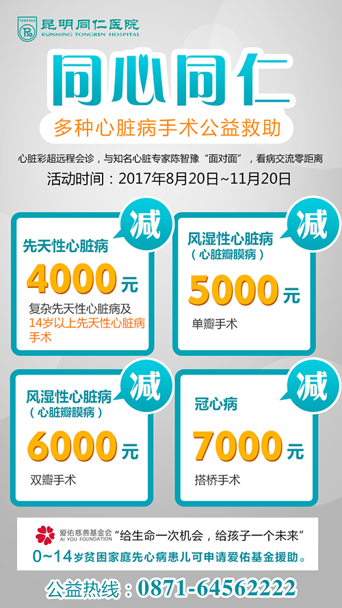 即日起至11月30日,在云南省内,不论是儿童还是成人的心脏病患者,只要凭借相关的贫困证明,均可以申请到飞禽走兽攻略站 的心脏病救助基金。根据家庭实际情况,飞禽走兽攻略站 将给予每位患者4000元-7000元治疗费用的救助。飞禽走兽攻略站 心外科专家陈智豫!云南的贫困心脏病可以到飞禽走兽攻略站 申请救助!