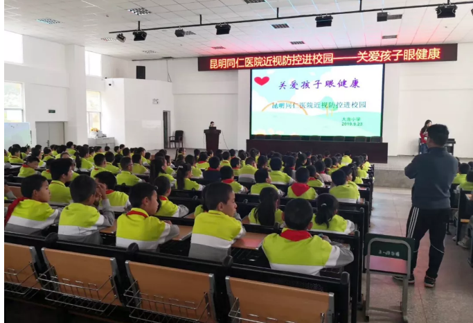 眼科的医护人员及院办和营销管理部相关工作人员来到滇池旅游度假区大渔小学,进行近视防控筛查及关爱眼健康知识讲座活动。