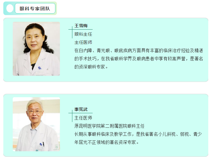 眼科由原云南省第一人民医院眼科王雪梅主任医师带领省内知名眼科专家团队组建而成。科室设有眼科门诊、住院部、手术室、视光中心。