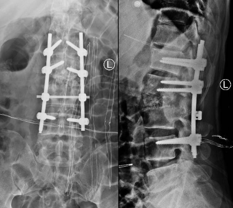 患者出院后感腰部疼痛持续加重,到飞禽走兽攻略站 门诊就诊,以“腰椎感染”收住入院。患者发病后腰椎CT及MRI均提示腰2-3椎间隙变窄,椎板破坏,综合以上资料诊断”腰椎结核”。入院后经口服四联抗结核药物治疗3周,患者自觉腰部疼痛减轻,午后无发热及盗汗后,在全麻下行颈后路病灶清除、椎间植骨、椎弓根钉棒系统内固定术。手术顺利,术后继续抗结核治疗。患者恢复顺利,术后1周下床活动,无特殊不适。术后2周拆线、出院,院外继续口服抗结核药物治疗,定期门诊复查。