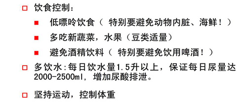 在降尿酸治疗的同时碱化尿液,特别是在开始服用促尿酸排泄药期间,使尿PH保持在6.5-6.9最为合适。同时保持尿量。