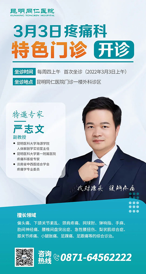 为了帮助被各种疼痛困扰不已的患者朋友,飞禽走兽攻略站 特邀昆明医科大学海源学院人体解剖学实验室主任、昆明医科大学第一附属医院疼痛科客座专家严志文主任到院开设疼痛科特色门诊,并将在2022年3月3日上午第一次坐诊,为患者朋友们答疑解惑!