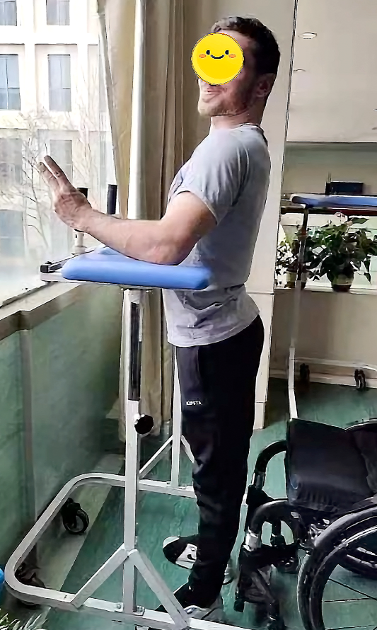 在采访时,患者马修就激动地用新学的中文分享着他的变化:“我现在的感受就是『一天比一天好』”。原来,自从受伤以后,马修就一直生活在轮椅上,再也没有站立起来与人平视过,导致他都已经忘记了自己的具体身高,而这样的心理落差是比外伤更令他难过的事情。但幸运的是,在经过手术和康复训练后,马修目前已经能够自己锁住双膝关节,扶着助行器站立,这样的恢复效果让他哪怕在艰难的康复训练中都始终保持着乐观的笑容。