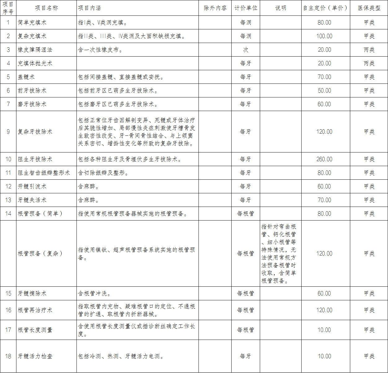 为促进口腔业务的拓展,满足患者多元化口腔治疗需求,我院本着公平、合法和诚实信用的原则,根据业务开展的需求对部分医疗服务项目价格进行自主定价,并在执行前一周进行公示,现将项目名称及价格公示如下: