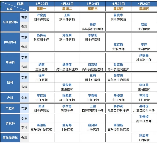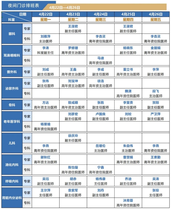4月22日—4月26日夜间门诊排班表