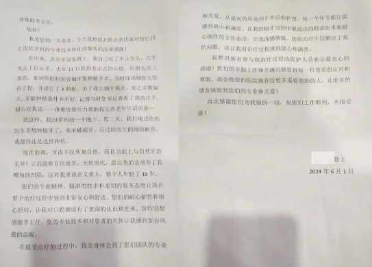 “治疗不仅解决了我的问题,还让我对治疗过程感到放心和满意,我想对所有参与我治疗过程的医护人员表示最衷心的感谢!”这段话来自于口腔科一位患者的感谢信,字里行间充满着对医护人员的感激和信任之情。