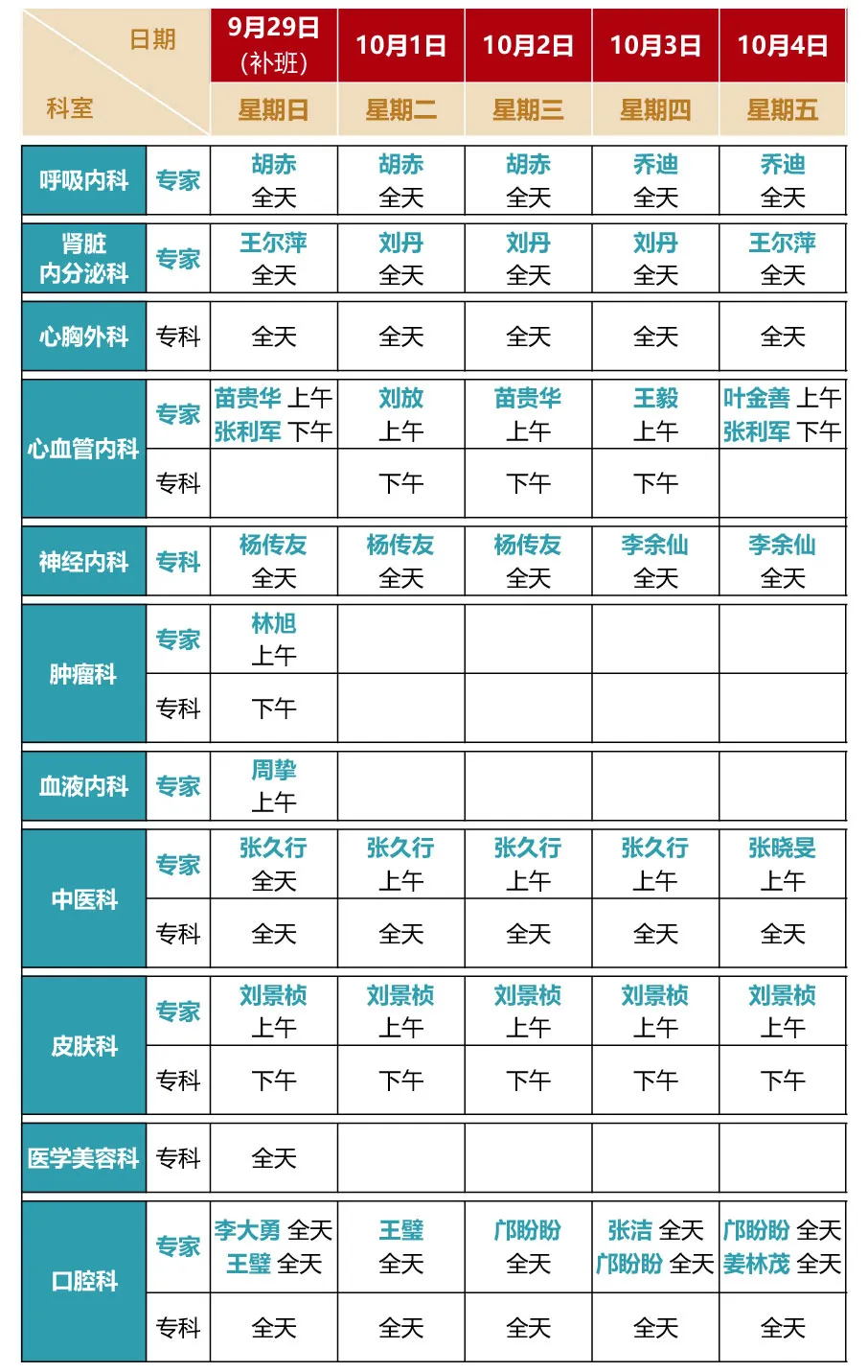 专家坐诊时间如下