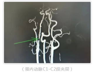 时间就是大脑!与患者家属沟通病情和治疗方案后,神经内科专家团队立即为王先生进行脑血管造影明确其堵塞血管,发现王先生颈内动脉C1-C2段夹层,管腔次全闭塞,远端血管被近端夹层中脱落的血栓栓塞导致脑梗死,需尽快介入治疗取出远端血栓、近端夹层血管植入支架使血管恢复正常,以避免发生更加严重的脑梗死。
