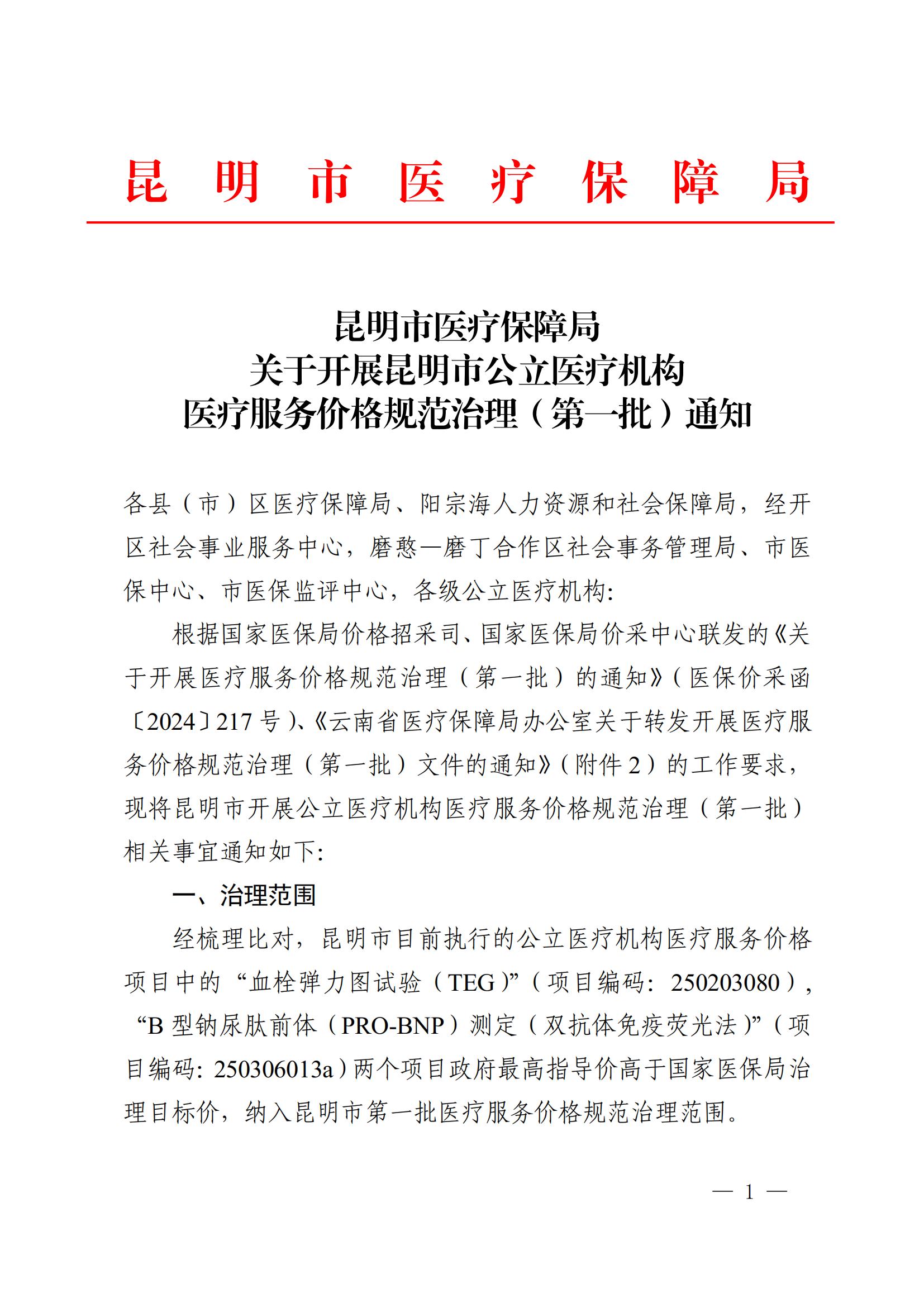 昆明市医疗保障局关于开展昆明市公立医疗机构医疗服务价格规范治理(第一批)