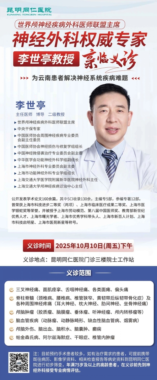 10月10日(周五)下午,中央干保专家、世界颅神经疾病外科医师联盟主席、上海交通大学医学院附属新华医院神经外科主任李世亭教授将亲临飞禽走兽攻略站 开展义诊活动。此次义诊将重点针对复杂颅脑肿瘤、三叉神经痛、面肌痉挛、舌咽神经痛、偏头痛及颈肩腰腿痛等疾病提供专业诊疗服务,让春城患者足不出省即可享受国际权威神经外科专家的精准诊疗。